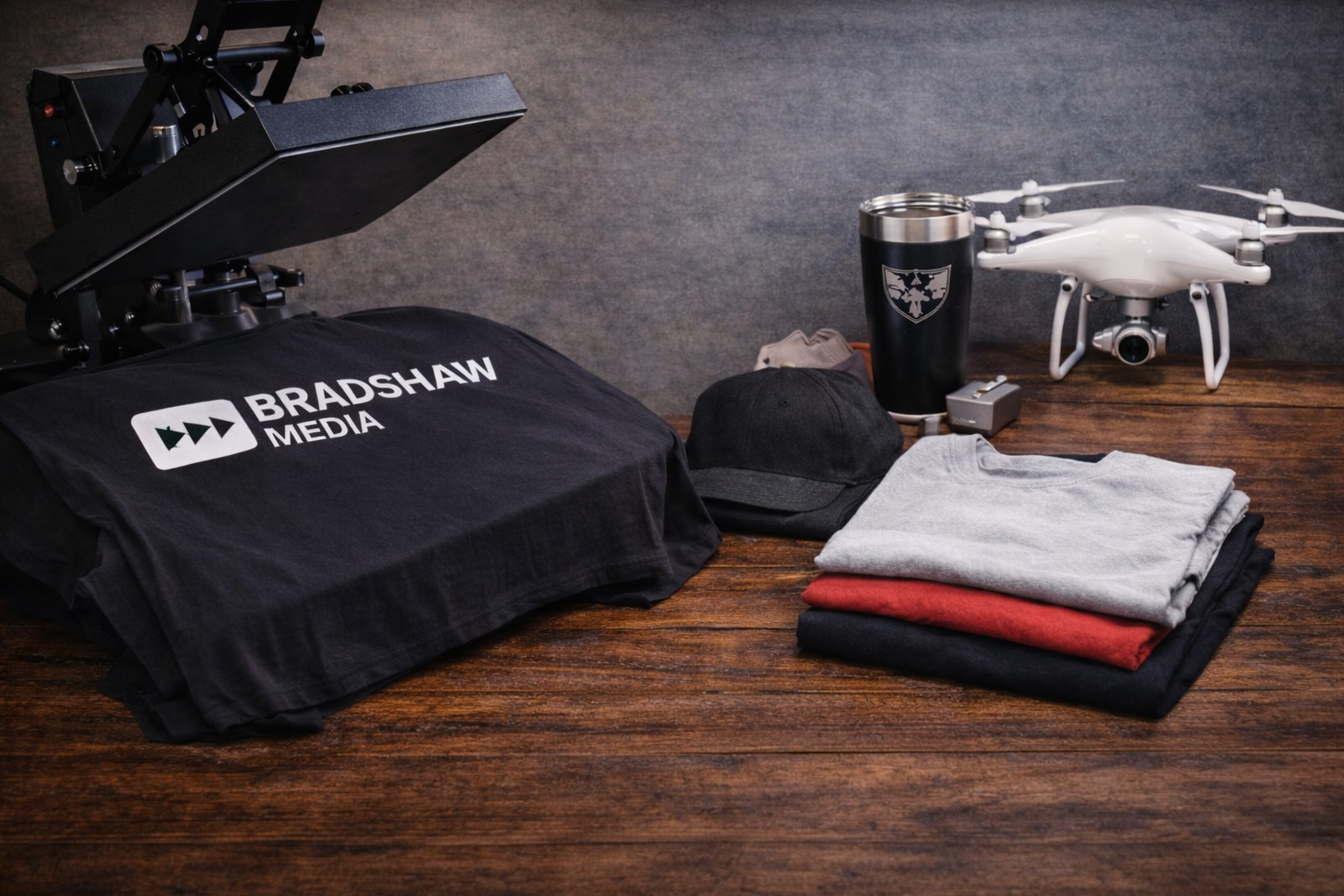 Here at Bradshaw Media, we offer a variety of services for you or your business. Looking for custom merch for your business? Uniforms for your employees? Aerial drone shots of your house for Christmas cards? We have you covered. We deliver high quality products in each category, and work to accommodate our clients requests.
